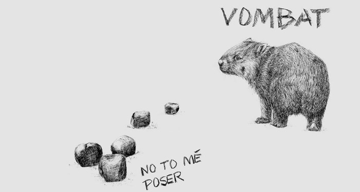 Vombat obecný pochází z Austrálie, je to vačnatec příbuzný koalám. Humorný titul na tričkách „No to mě poser“ odkazuje na trus vombatů. Vombat je slavný tím, že jako jediný savec na světě produkuje hranatý trus, který má tvar kostiček. Střeva vombata jsou extrémně dlouhá a nerovnoměrně pružná, potravu (trávu a kořínky) tráví velmi dlouho, různé části střev stlačují obsah rozdílně a tím vzniká hranatý tvar. Kostky se nekutálejí ze skal a vyvýšených míst a vombat si jimi značkuje své teritorium.